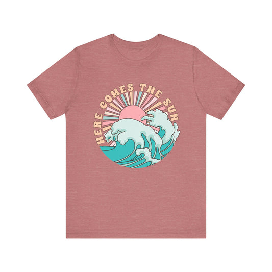 Unisex Beach Vibes Tee | Here Comes the Sun, Summer Shirt, Wave Art Tee, Gift for Ocean Lovers, Relaxed Summer Style