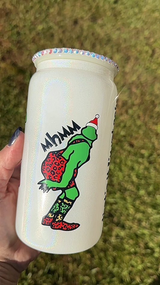 Retro Christmas Themed White Shimmer Can Cup with Jeweled Lid , 16 oz