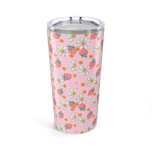 Floral Pattern Tumbler - 20oz Insulated Travel Mug, Pink Strawberry Design, Perfect for Summer Picnics, Gifts for Her, Reusable Drinkware