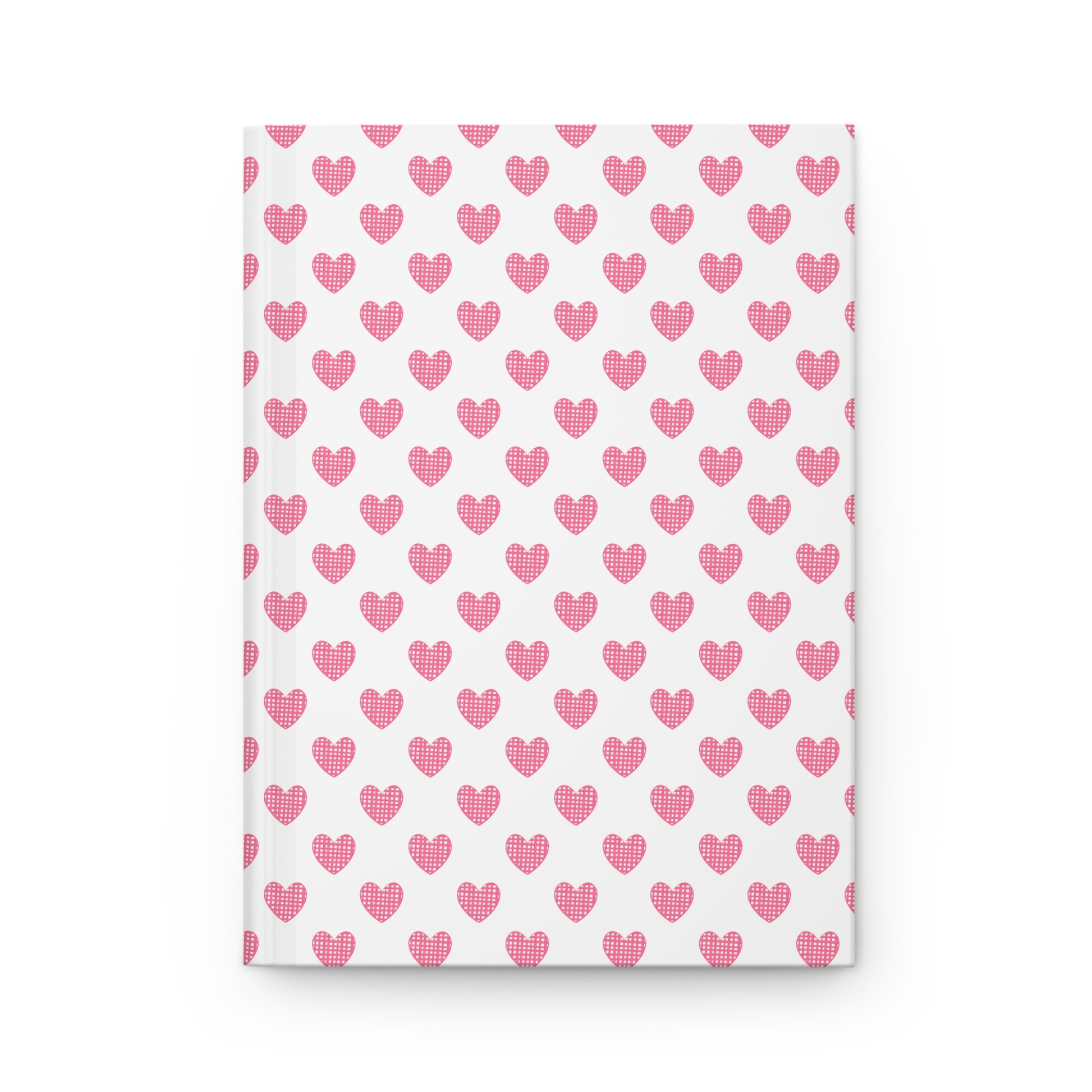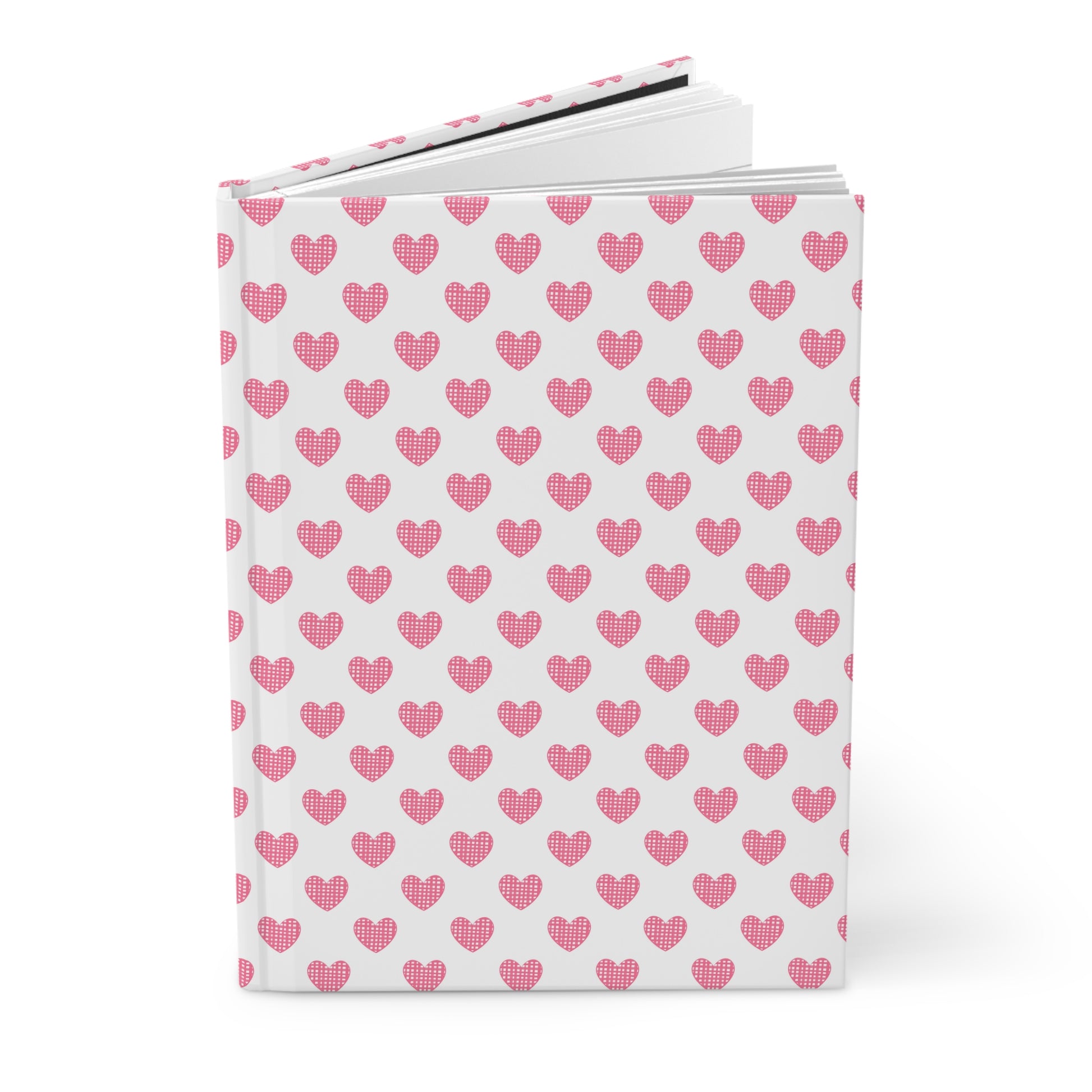 This matte hardcover journal wraps a playful cascade of hand-drawn pink hearts around every page-edge, turning note-taking into a small, daily delight. The smooth matte laminated cover reduces glare while protecting the vibrant, full-wrap print. Inside, 150 lined pages sit on a sewn spine that lets the journal open flat and bend with gentle use. Perforated sheets provide flexibility: tear out a page for lists, sketches, or a quick, handwritten note. A tiny production barcode sits discreetly on the back cover. This journal feels personal and cheerful — a compact companion for pockets of creativity, quiet reflections, or busy to-do lists.