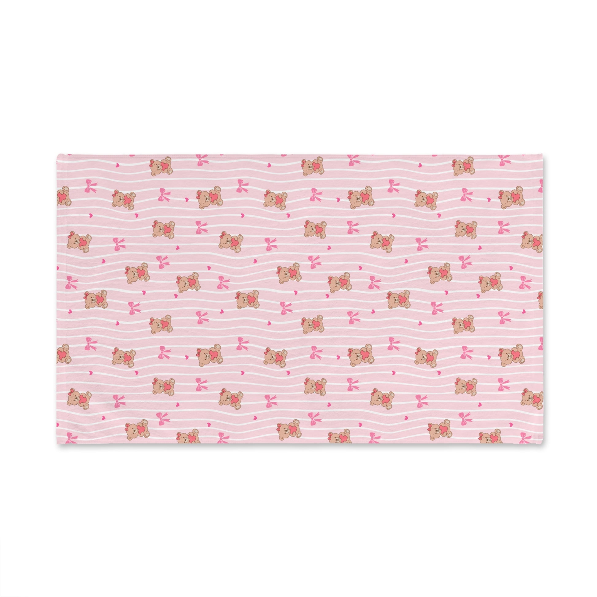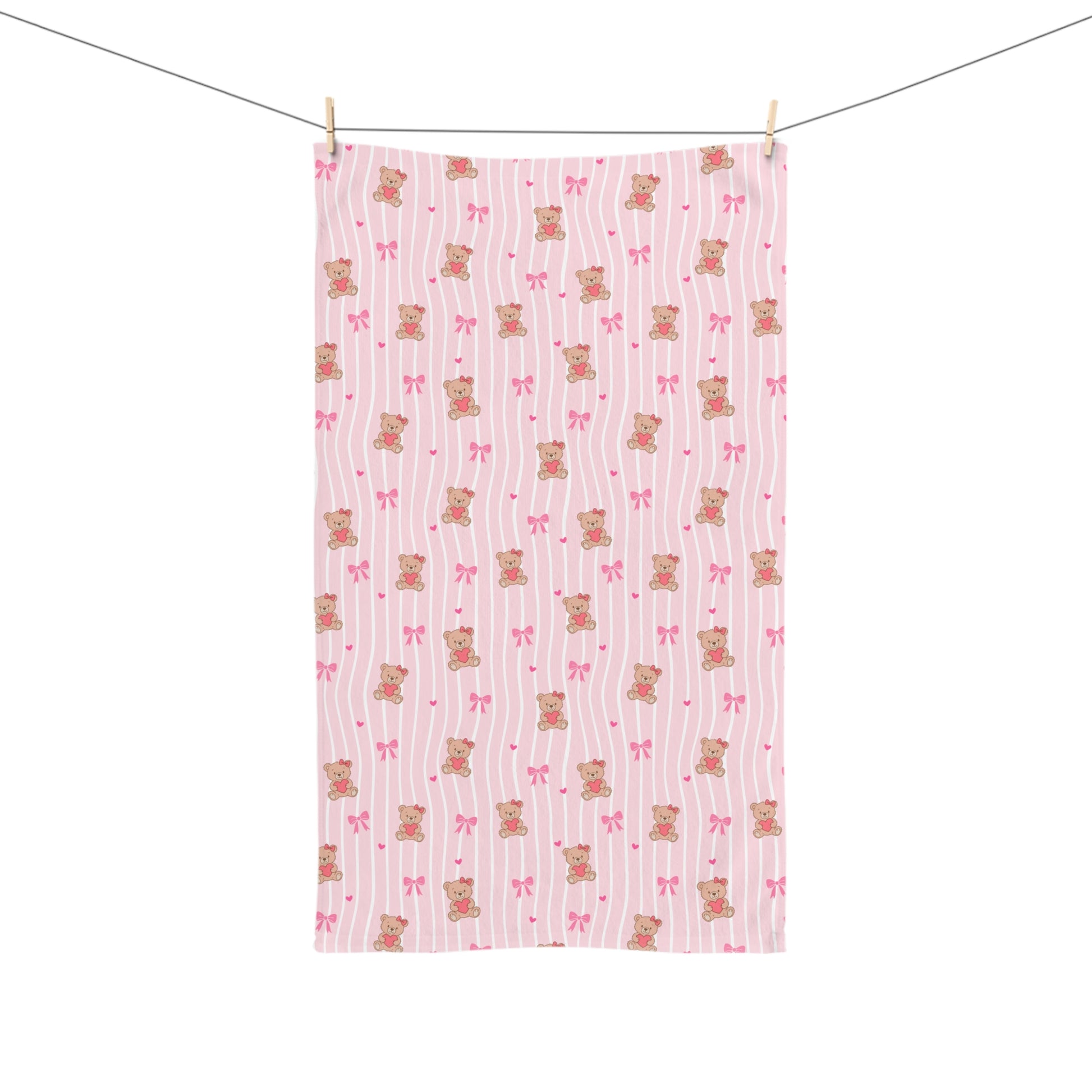 A soft, charming hand towel designed to bring a gentle, cozy touch to everyday moments. Pale pink stripes and tiny teddy-bear motifs create a sweet, nostalgic vibe that brightens a nursery sink, bathroom countertop, or kitchen towel rack. The fabric feels lightweight and plush against skin while absorbing spills with ease. Printed on one side with vivid, long-lasting colors, this towel dries quickly and keeps its shape through regular use. Use it to add a playful, comforting accent to morning routines or to tuck into a baby shower basket as a thoughtful, usable keepsake.